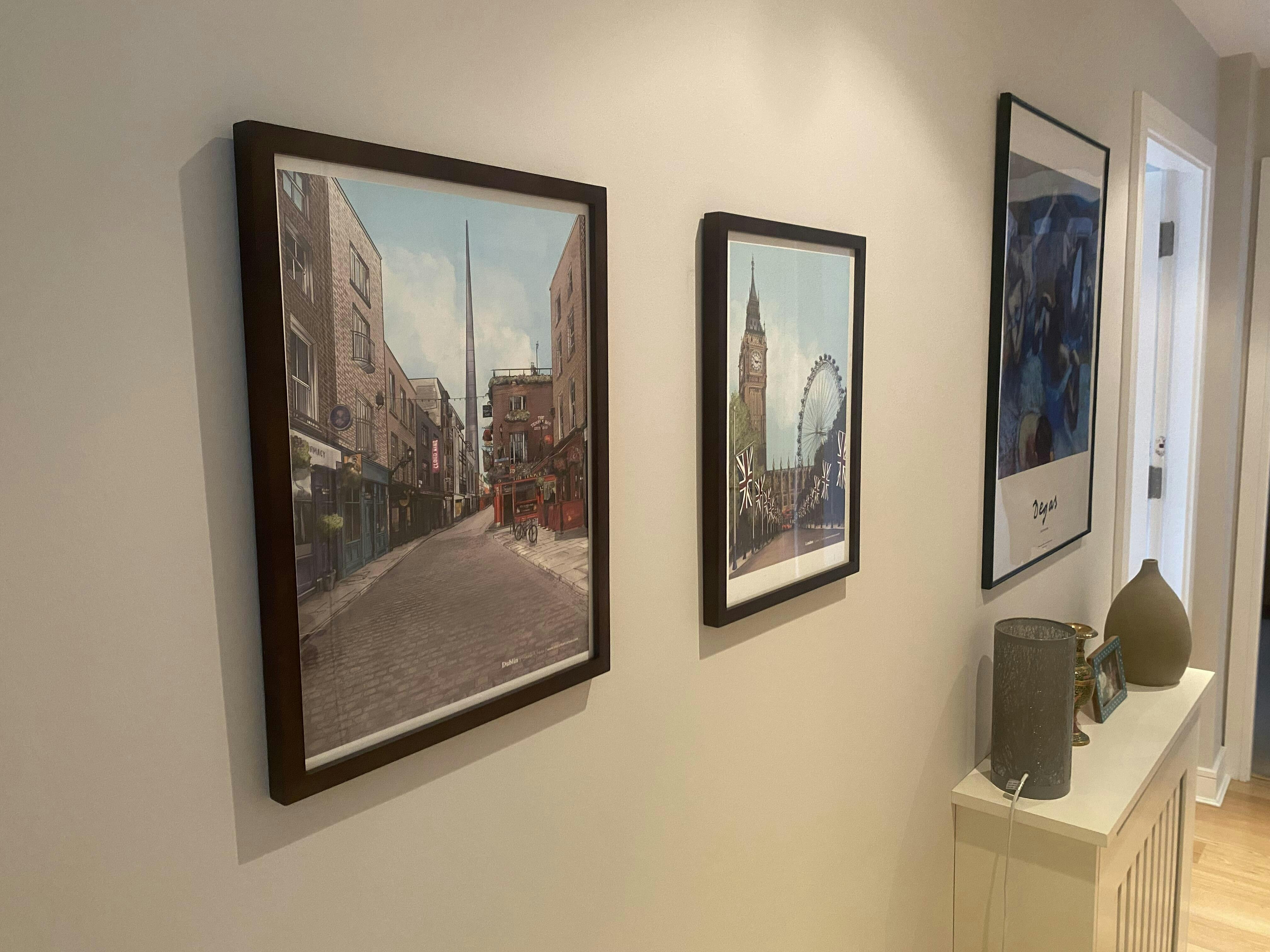 Our frames are made from durable pine and come in four colours. They have shatterproof plexiglass to protect your artwork and include hanging hardware.